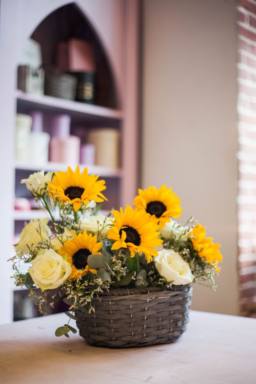 Kompozycja kwiatowa w koszu ze słoneczników