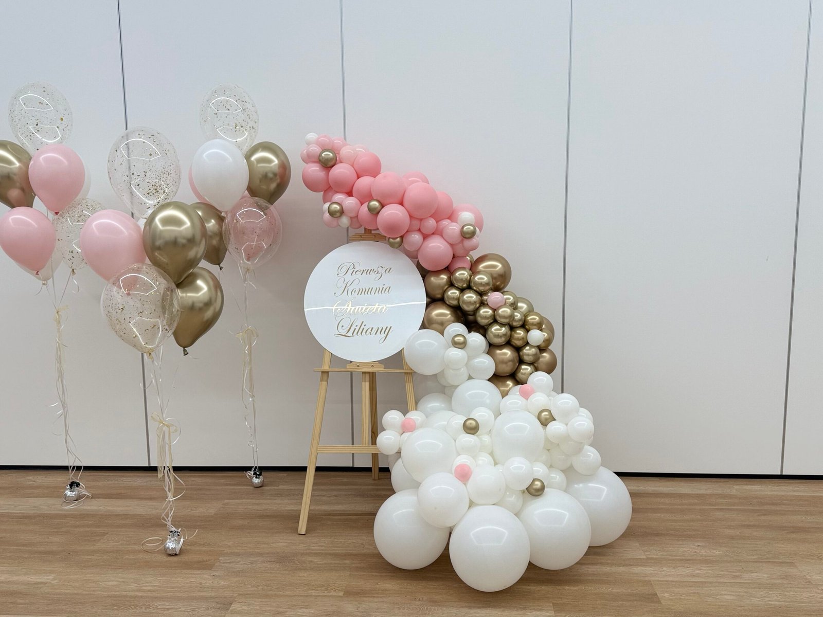 Elegancka dekoracja okolicznościowa z girlandą balonową w stylu organicznym oraz bukietami balonów z helem. Kompozycja idealnie sprawdzi się na komunię, urodziny, baby shower lub inne przyjęcie rodzinne.